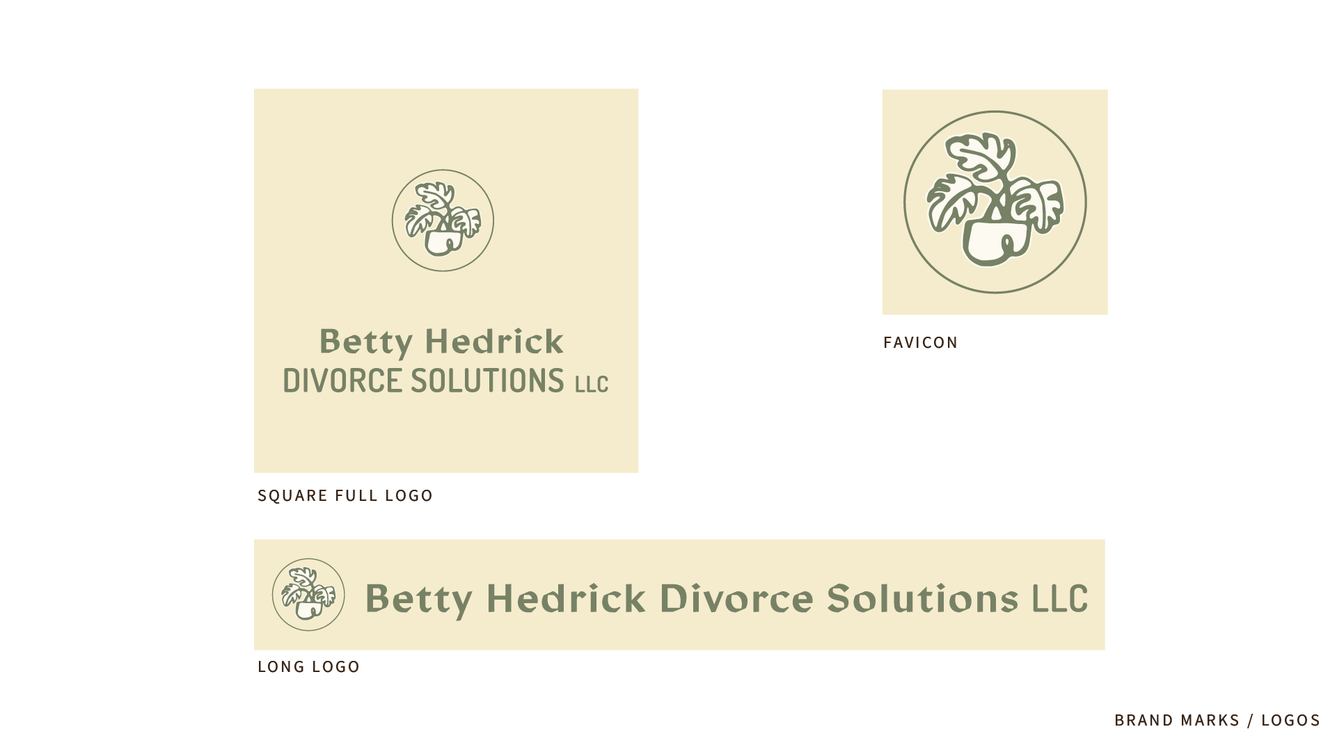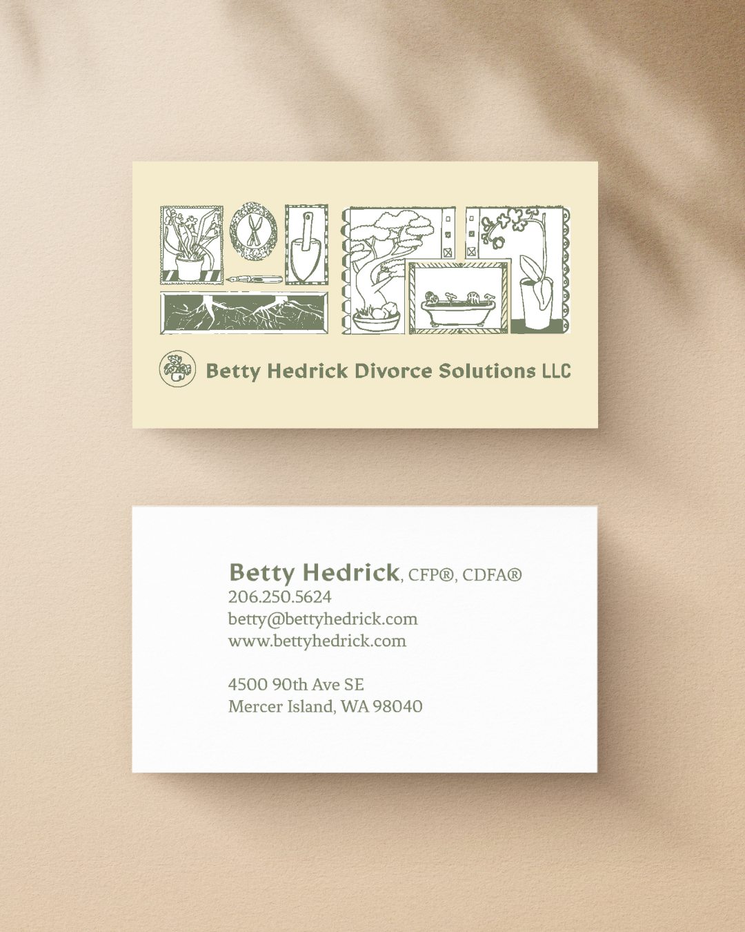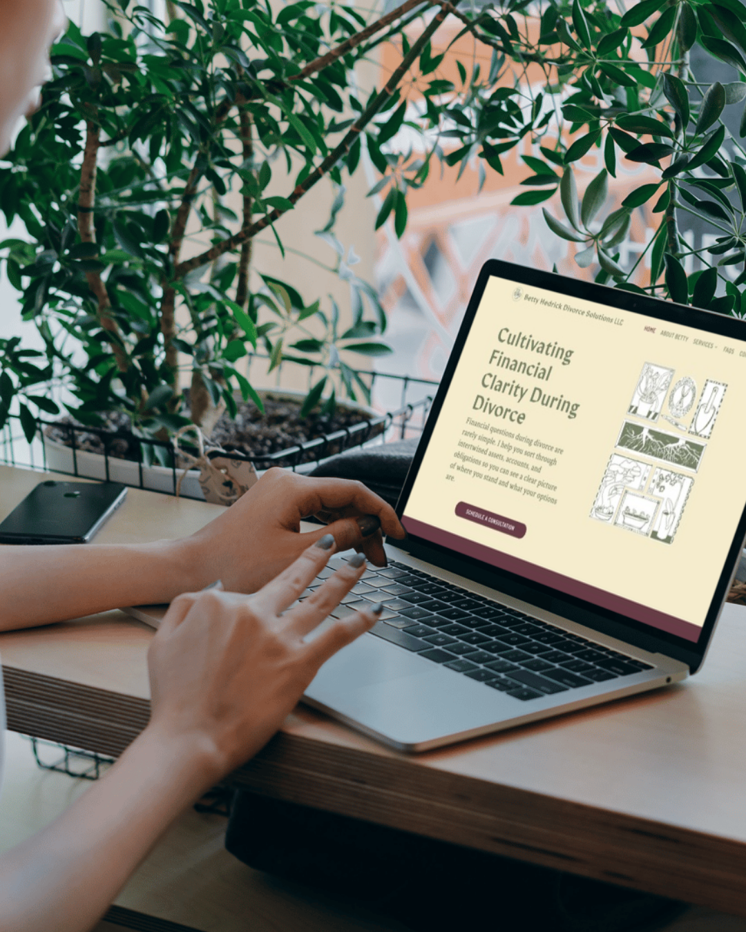 The brand identity reflects this philosophy through a custom illustration system built on the metaphor of tending plants. Just as a gardener carefully separates root systems to allow each plant to thrive independently, Betty helps clients disentangle shared finances so both parties can flourish. The hand-drawn illustrations – featuring framed vignettes of gardening tools, plants, trees, and root systems – capture the artisanal care she brings to her work. The warm palette of deep mauve, sage green, and cream creates an atmosphere of calm and trust, while the elegant monstera icon serves as a memorable symbol of growth and resilience.