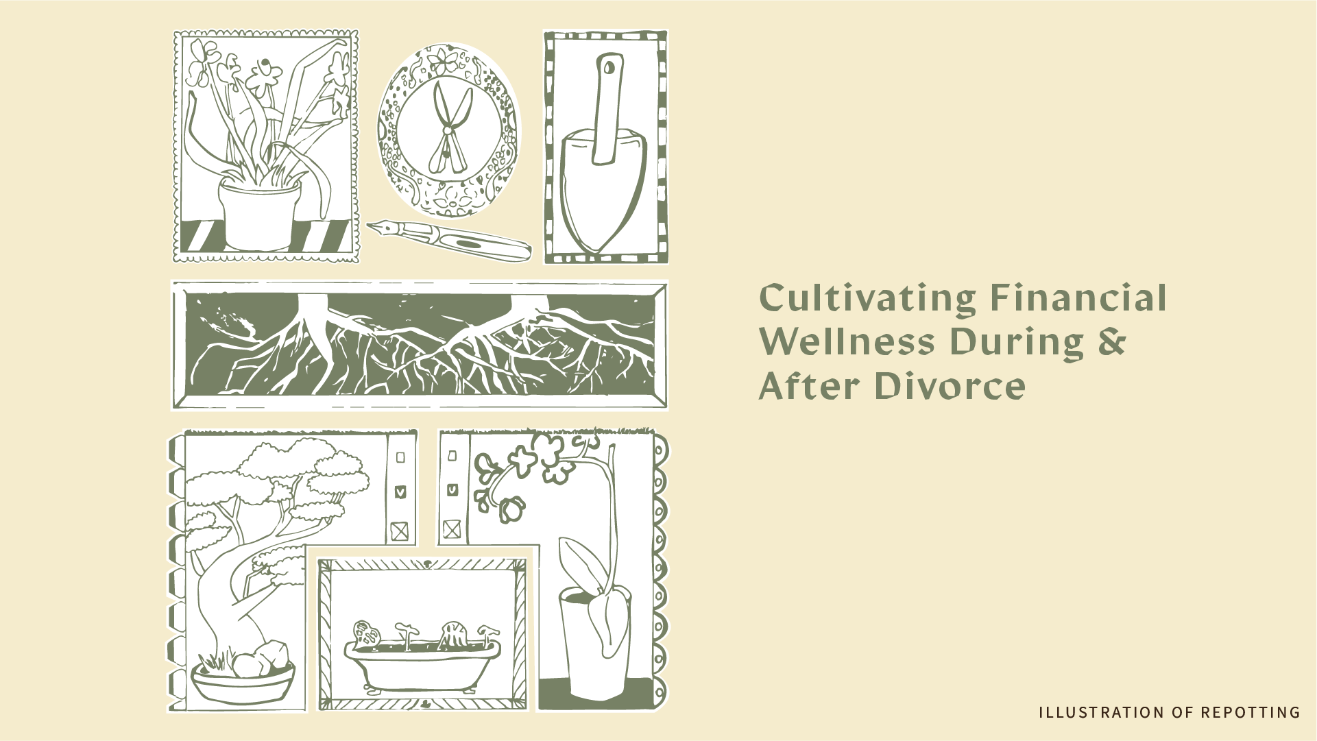 Custom illustration system based on the garden metaphor - hand-drawn vignettes of plants, roots, gardening tools, and nature scenes that visualize the careful work of financial separation and growth