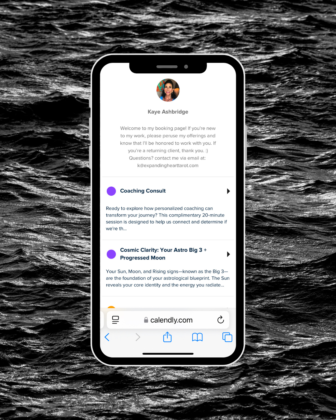 WordPress Website — A custom site connected to MailerLite and her calendar system. The site showcases her full range of offerings—individual readings, workshops, and tarot year scopes.