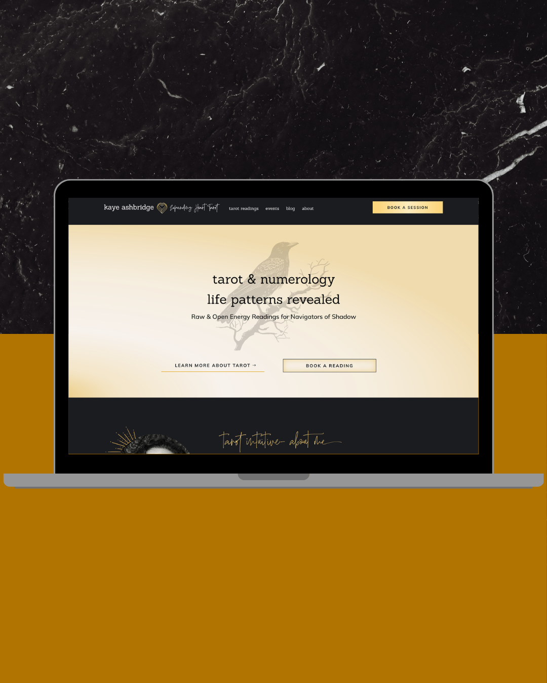 Brand Identity with the Raven — We developed a brand centered around the raven, an image deeply meaningful to Kaye. This visual thread appears throughout her website, business cards, and all brand materials.